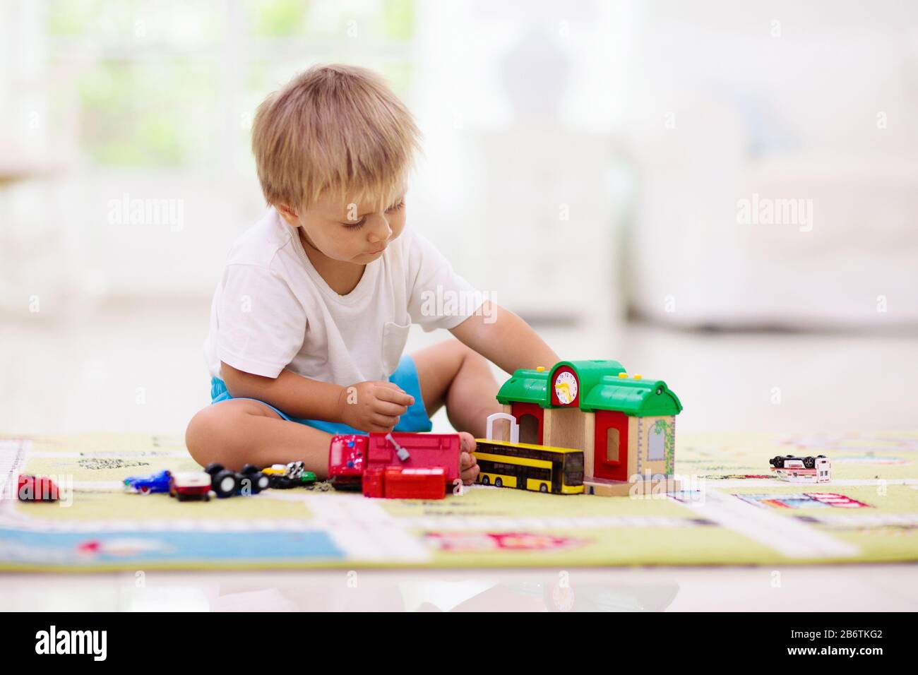 Little Boy Playing Toy Cars On Play Mat Young Kid With Colorful Educational Vehicle And Transport Toys On Carpet City Street Map Rug Child Driving Stock Photo Alamy